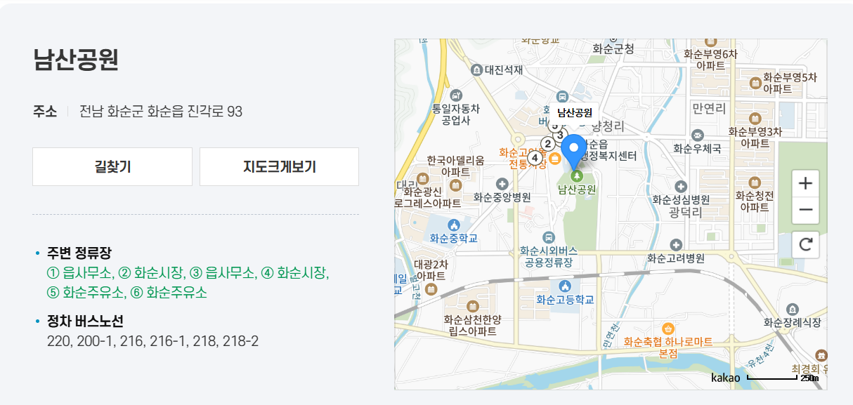 - B코스: 군민종합센터 → 미륭타운 → 남산공원 → 화순군청
