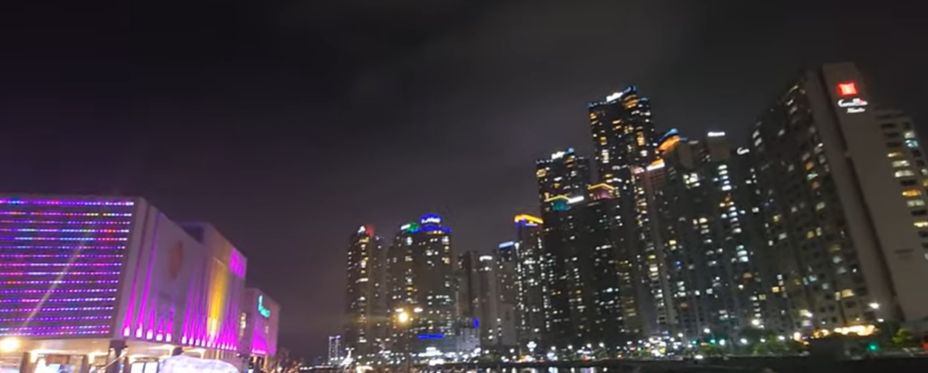 마린시티의 고층 건물들이 조명에 반짝이고, 요트들이 정박한 그 앞에서 바라보는 풍경.
