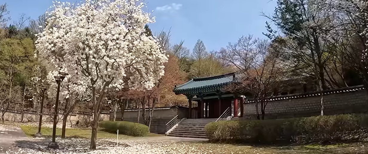 - 사진 포인트: 도서관 돌담길 옆 벚꽃, 고즈넉한 정원